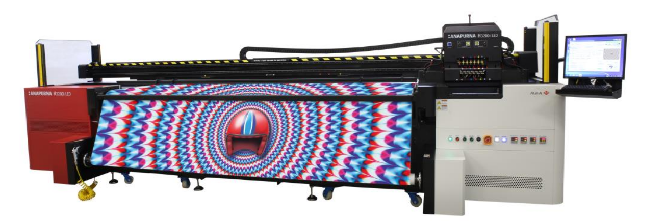 – Agfa Graphics -Anapurna H3200i LED –   The Anapurna H3200i LED is a high-speed hybrid UV LED-curable inkjet system with a printing width of 3.2 m for indoor and outdoor applications